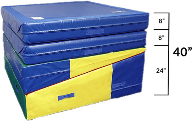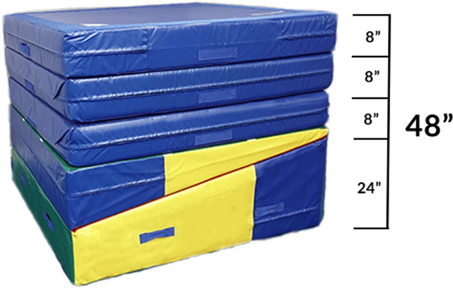 This four-piece system consists of one 5-ft x 10-ft x 24-in Folding Incline we call ‘The Big Cheese’ and three 5-ft x 5-ft x 8-in Modular Mats that make up the required 32-in, 40-in and 48-in height landing surfaces. All pieces are covered in premium 18oz vinyl and have Velcro connections that secure the stack of mats together during the most rigorous Level 3 or Xcel Silver vault training sessions!